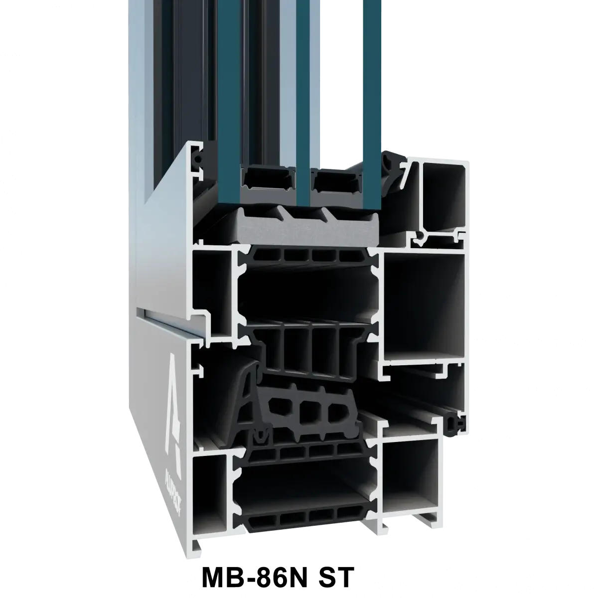 System MB-86N to zaawansowane rozwiązanie, które dzięki lepszym parametrom termicznym i szczelnościowym jest idealnym wyborem dla klientów poszukujących wyższej efektywności energetycznej. Jedną z zalet systemu jest wysoka wytrzymałość profili, co pozwala na wykonywanie dużych i ciężkich konstrukcji.